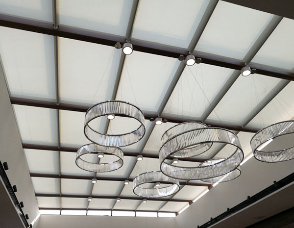 FSS天棚簾系統(tǒng)主要有管狀電機(jī)和彈性張力系統(tǒng)組成。一端為驅(qū)動軸,內(nèi)裝管狀電機(jī);另一端為從動軸,內(nèi)裝彈簧機(jī)構(gòu),電機(jī)正轉(zhuǎn)帶動面料前行,另一端的彈簧逐漸收緊,將面料張挺,電機(jī)反轉(zhuǎn)彈簧逐漸放松,遮陽面料卷回。其操作簡便,電機(jī)工作時噪音小,運(yùn)行平穩(wěn)。