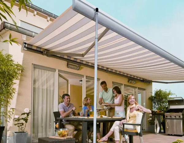 3、曲臂遮陽篷,在遮擋炎炎夏日的同時,能夠使強烈的陽光以漫射光的形式反射入室內(nèi),使室內(nèi)光線明亮而不眩目,并且不影響從室內(nèi)看出的窗外景觀,將人們的生活空間從室內(nèi)延伸到室外,創(chuàng)造出了新的居住空間;